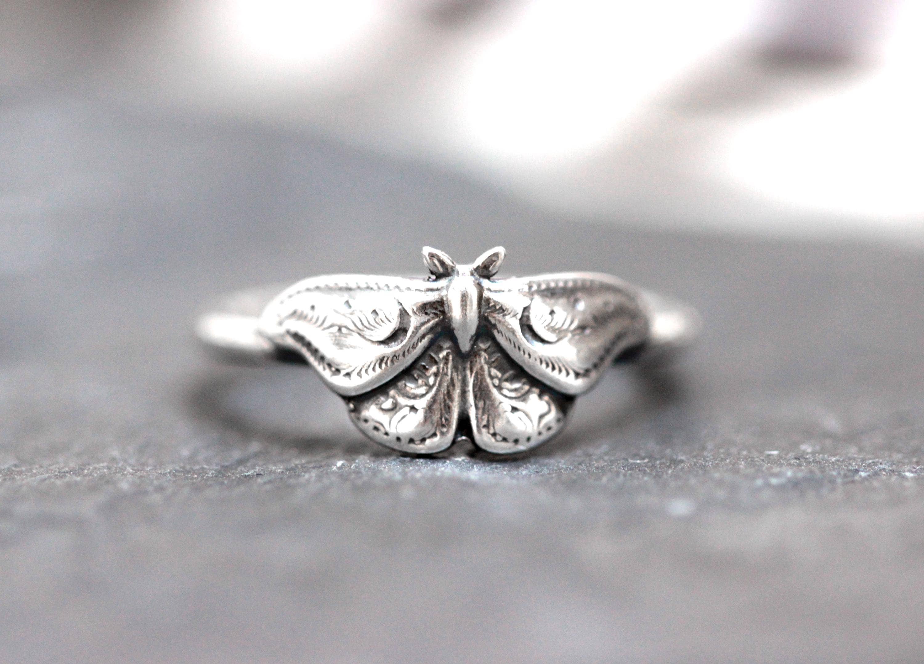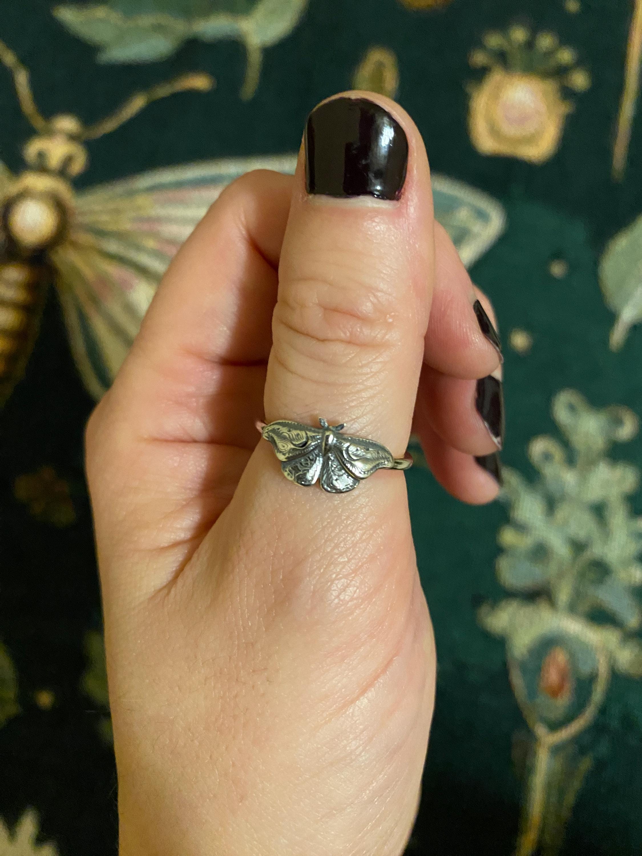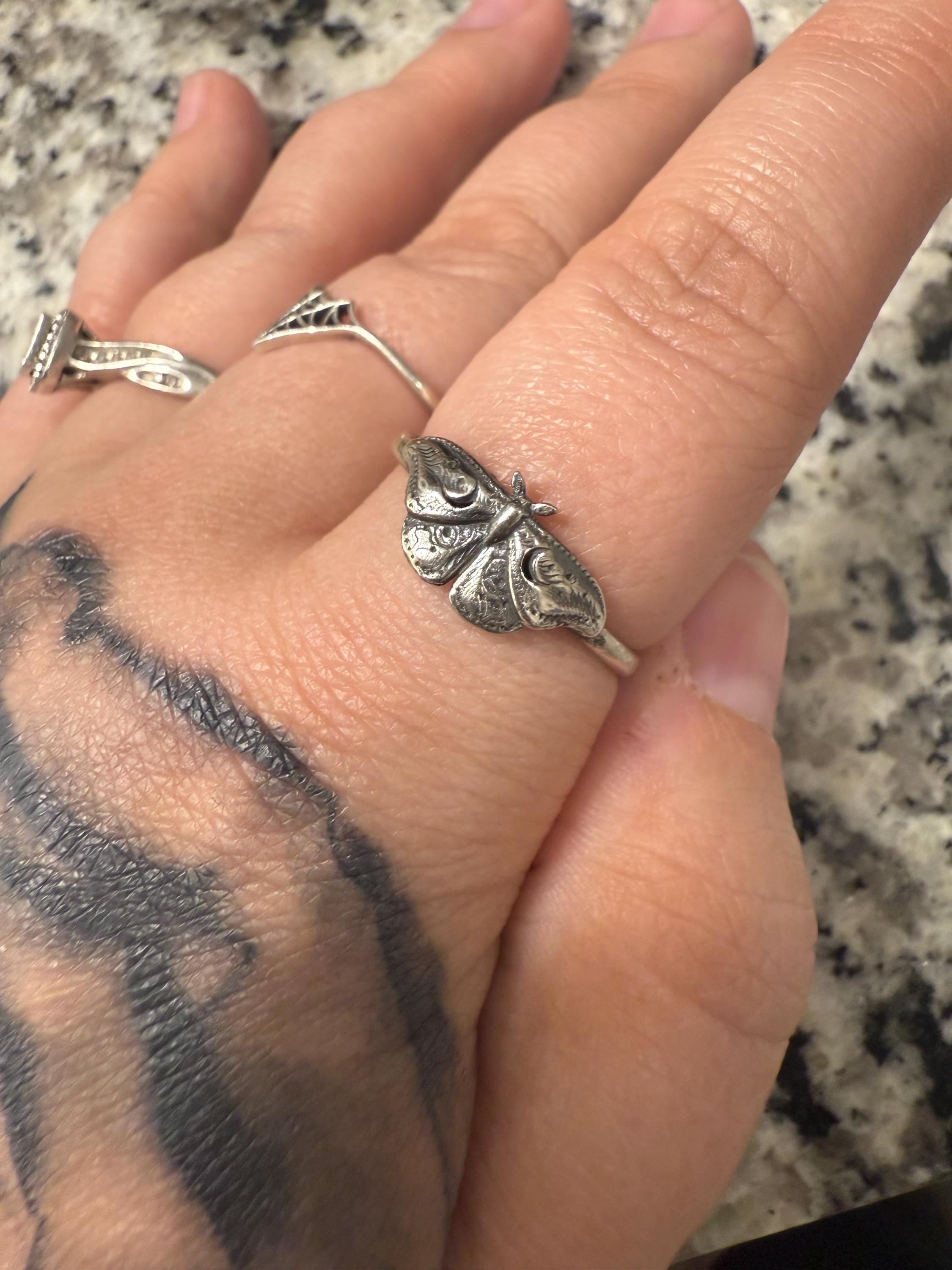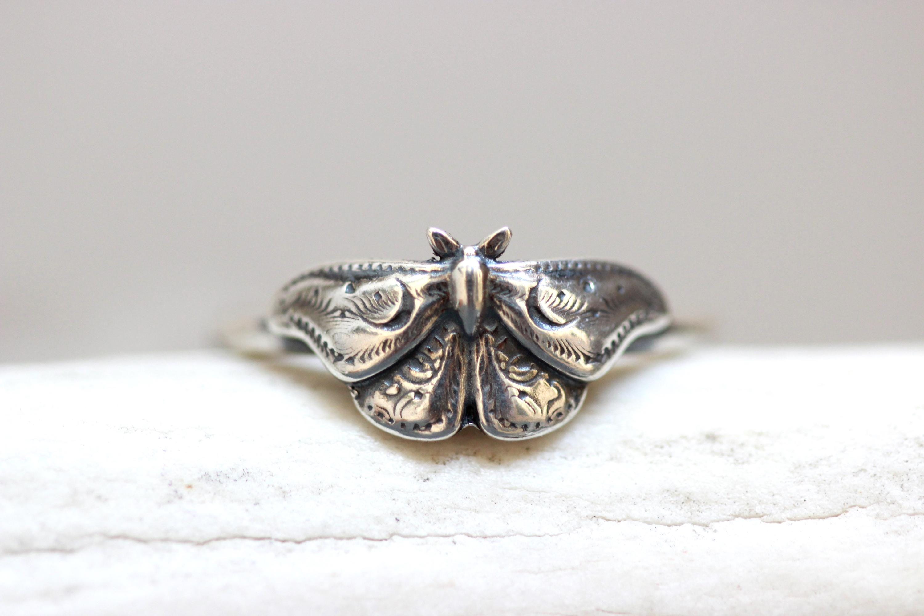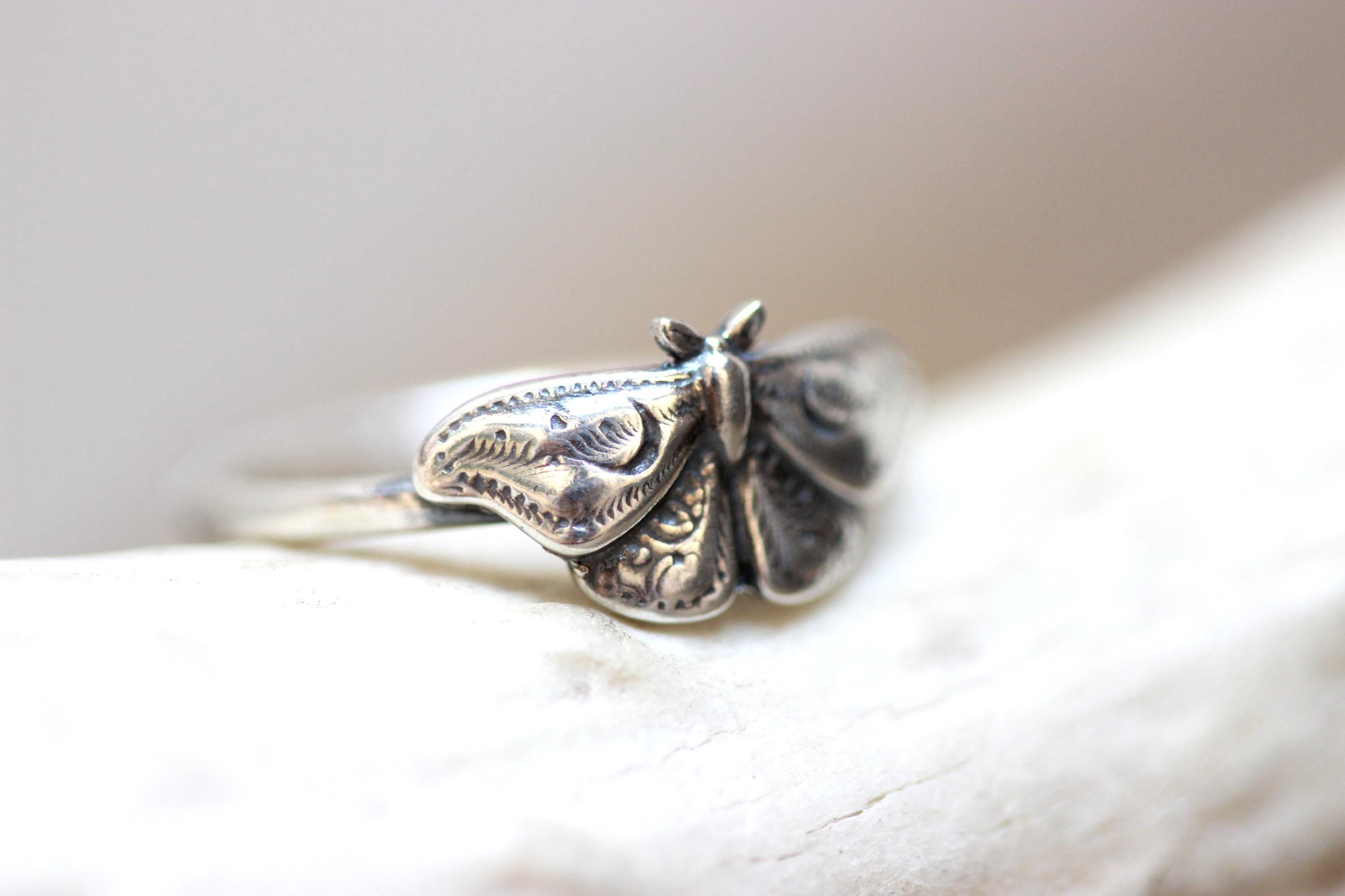 This item is a beautiful and delicate sterling silver Hawk Moth ring. The elegant and mysterious moth shape features intricate details including two crescent moons. The ring is fired from 14 gauge sterling silver round wire. Layer with other rings for an edgy look.