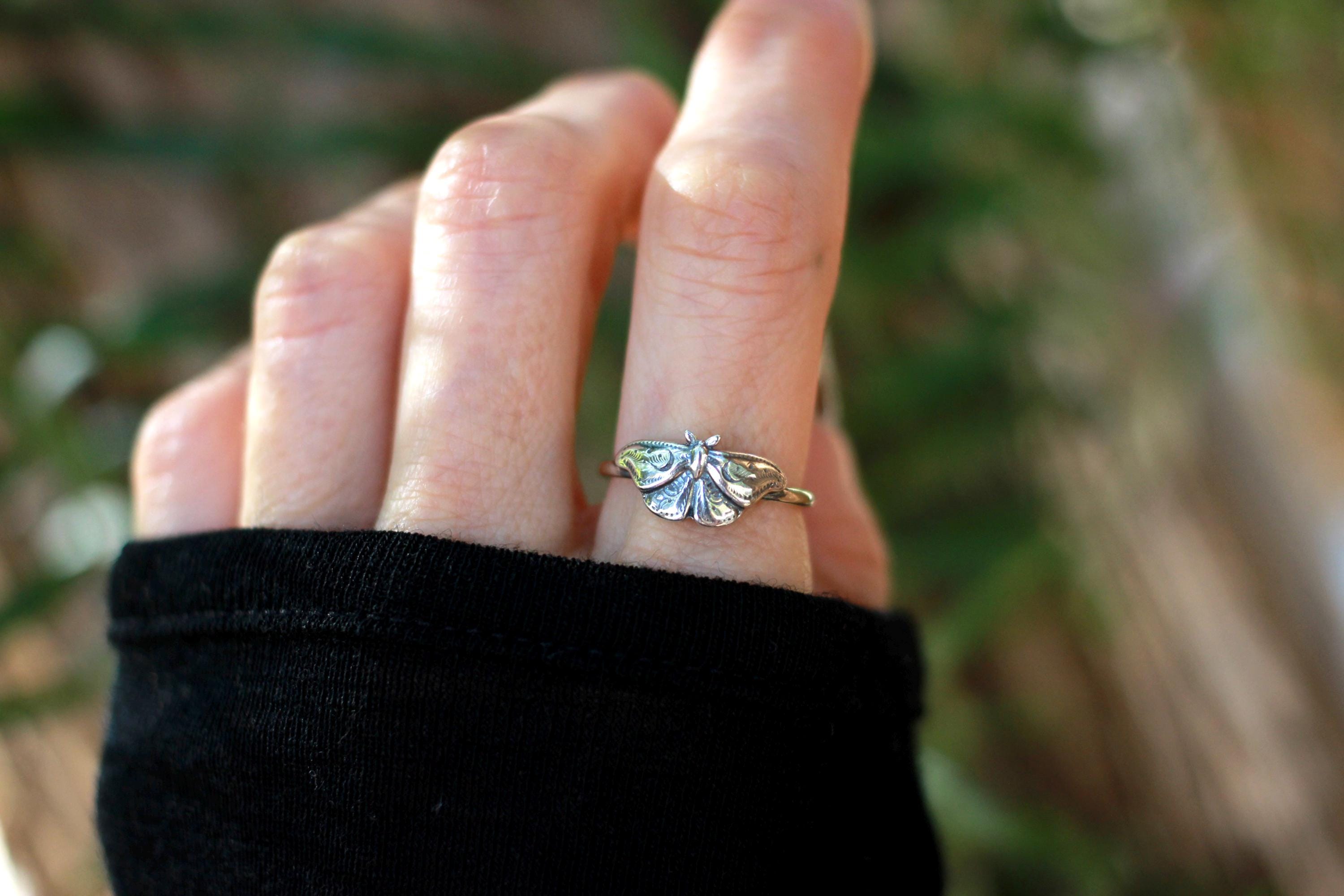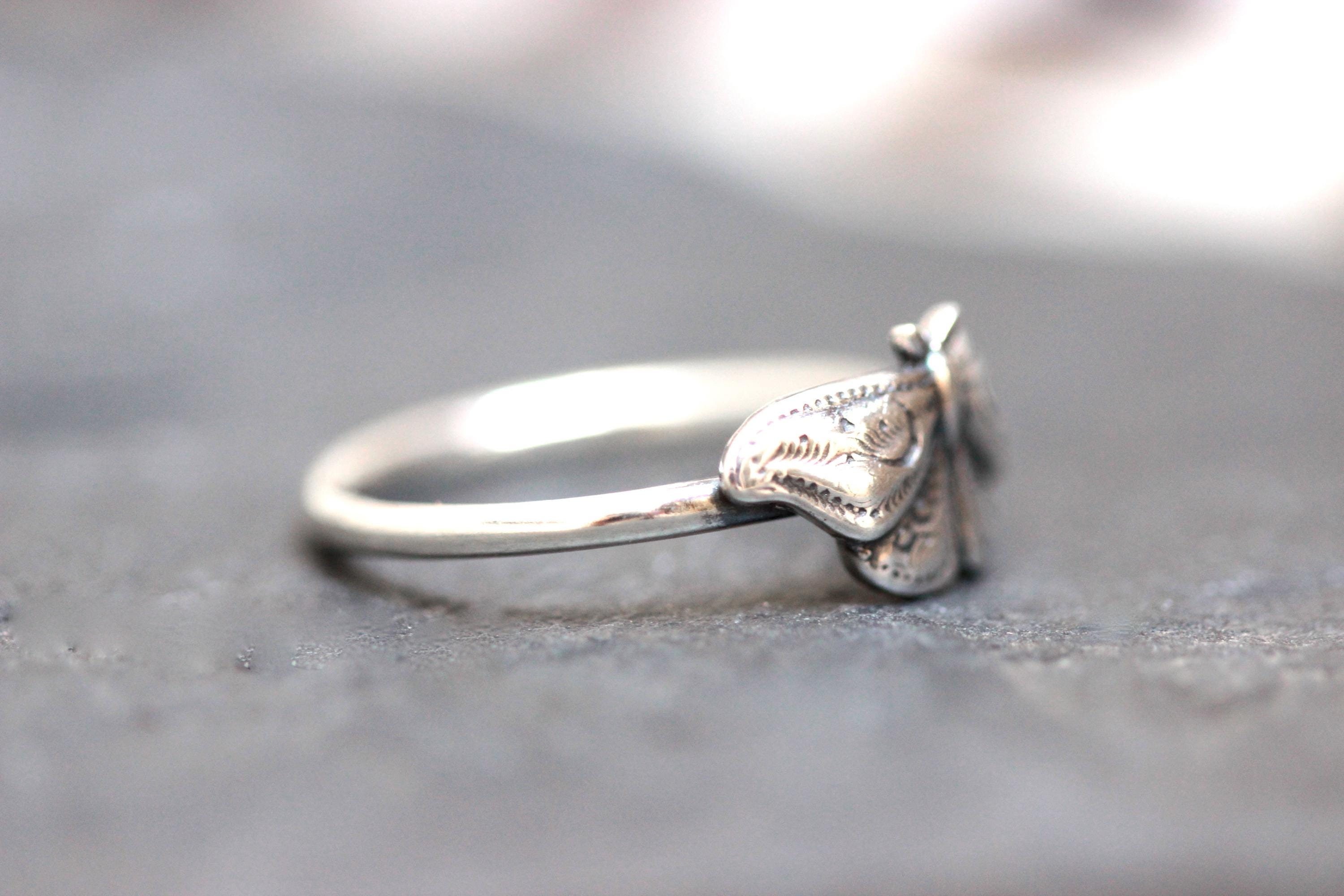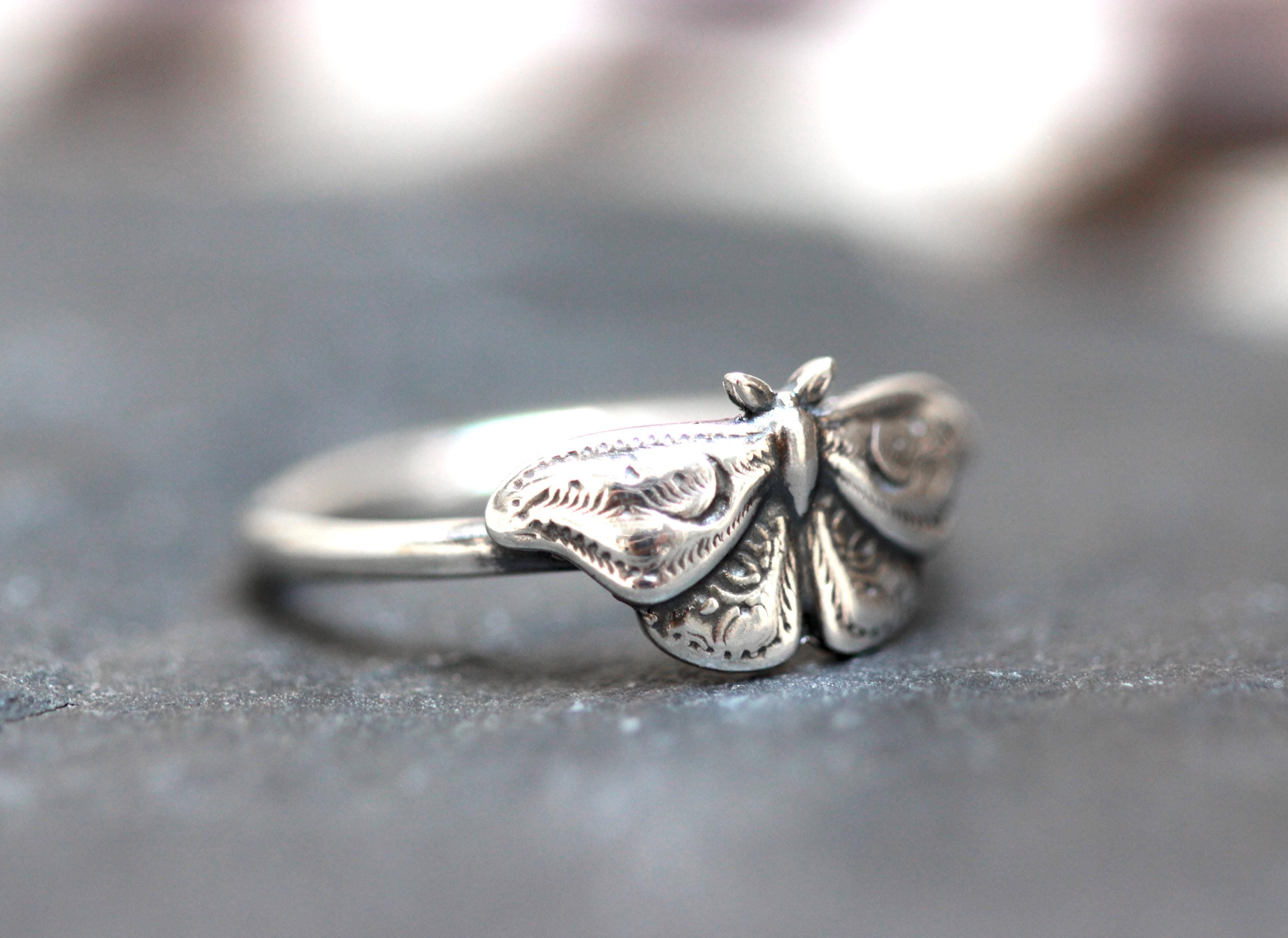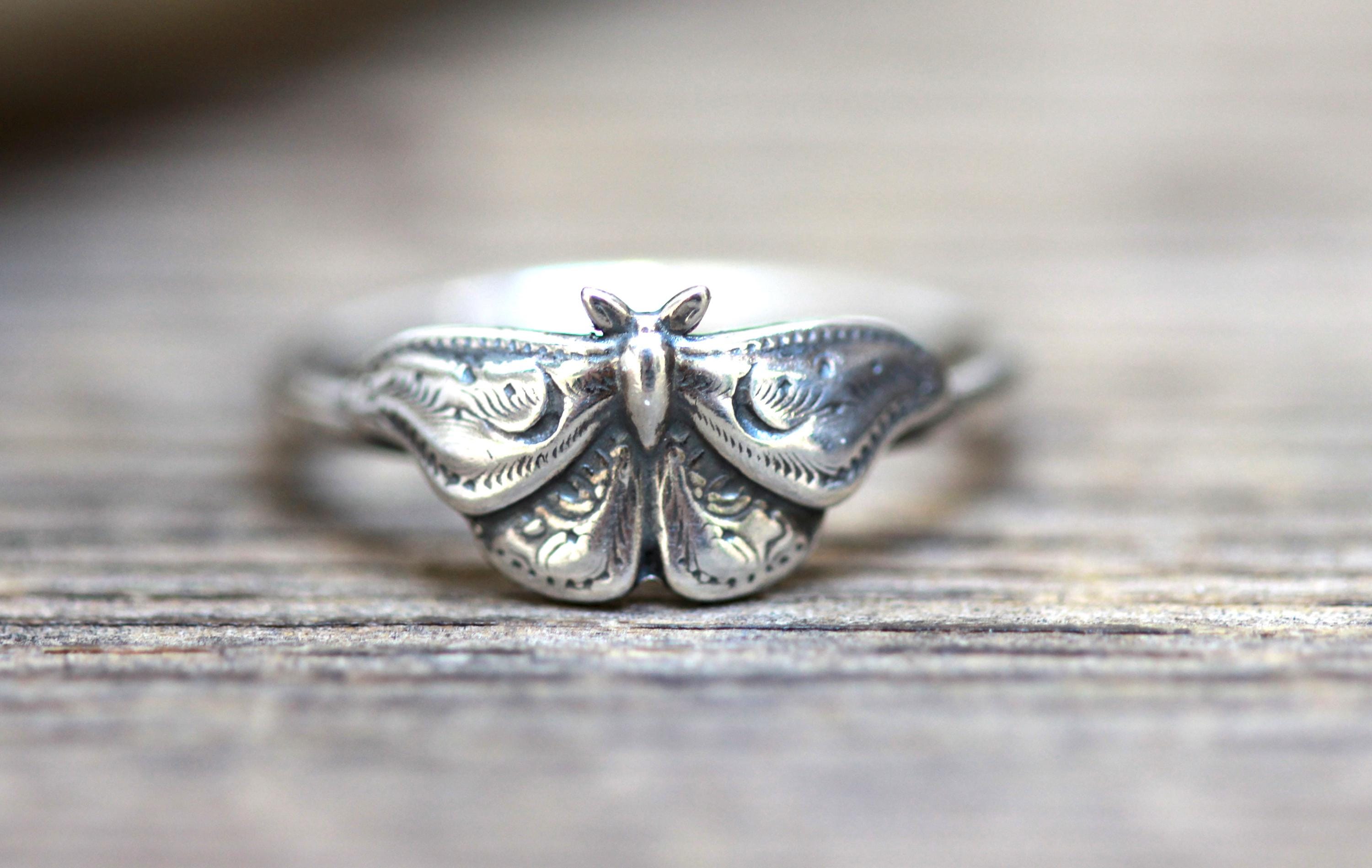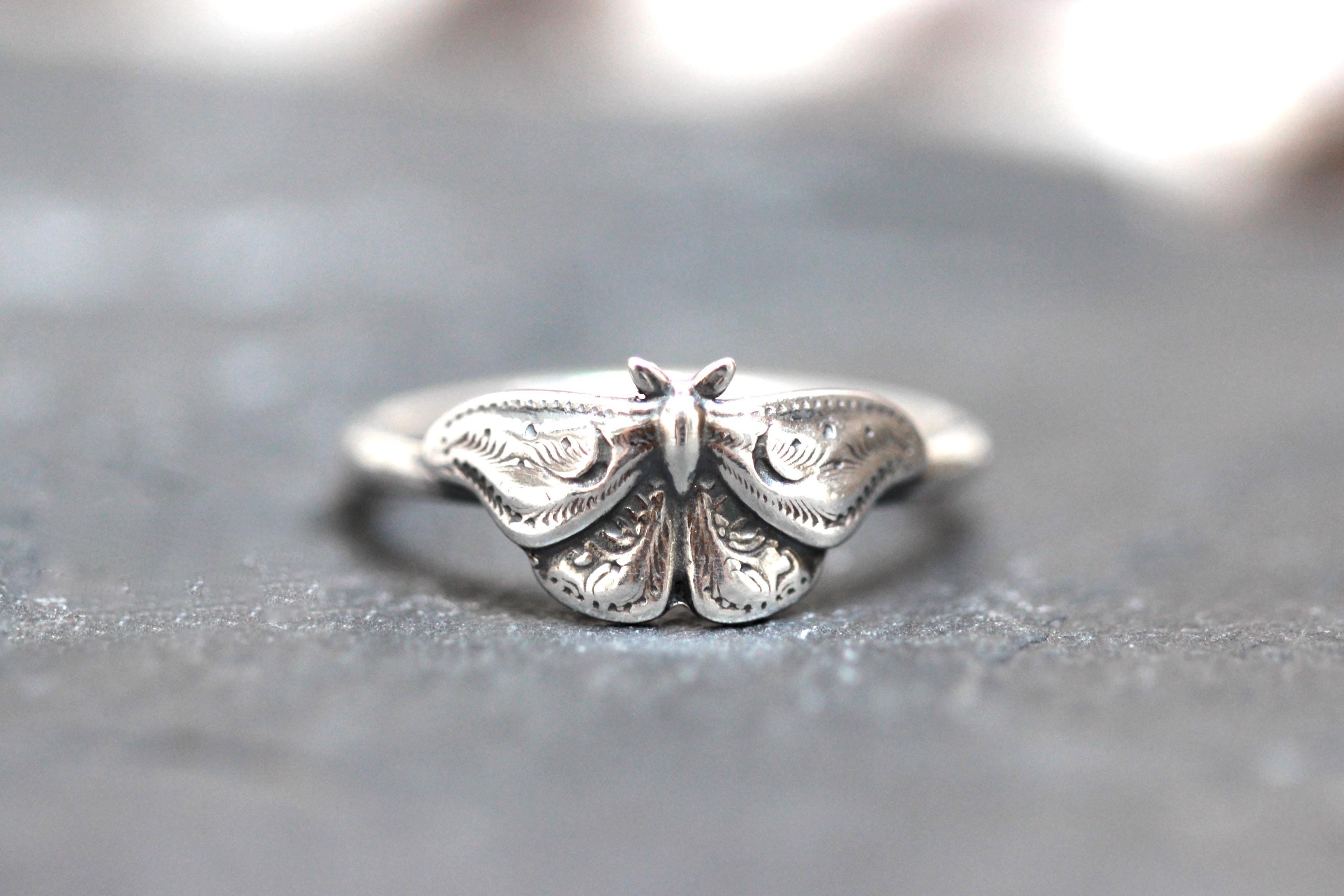 This item is a beautiful and delicate sterling silver Hawk Moth ring. The elegant and mysterious moth shape features intricate details including two crescent moons. The ring is fired from 14 gauge sterling silver round wire. Layer with other rings for an edgy look.