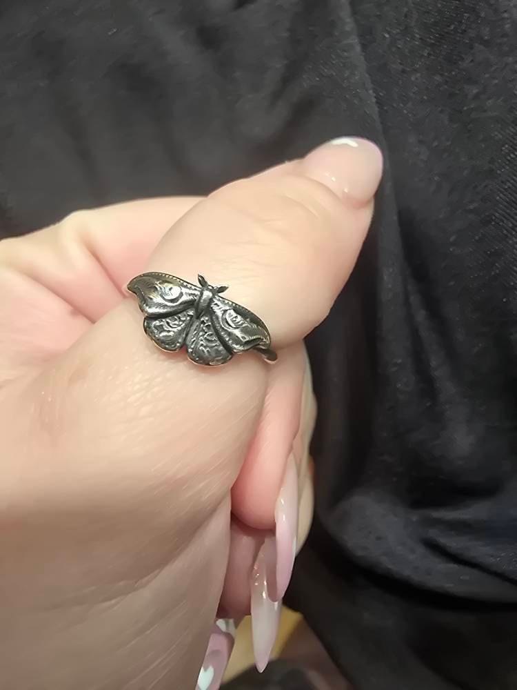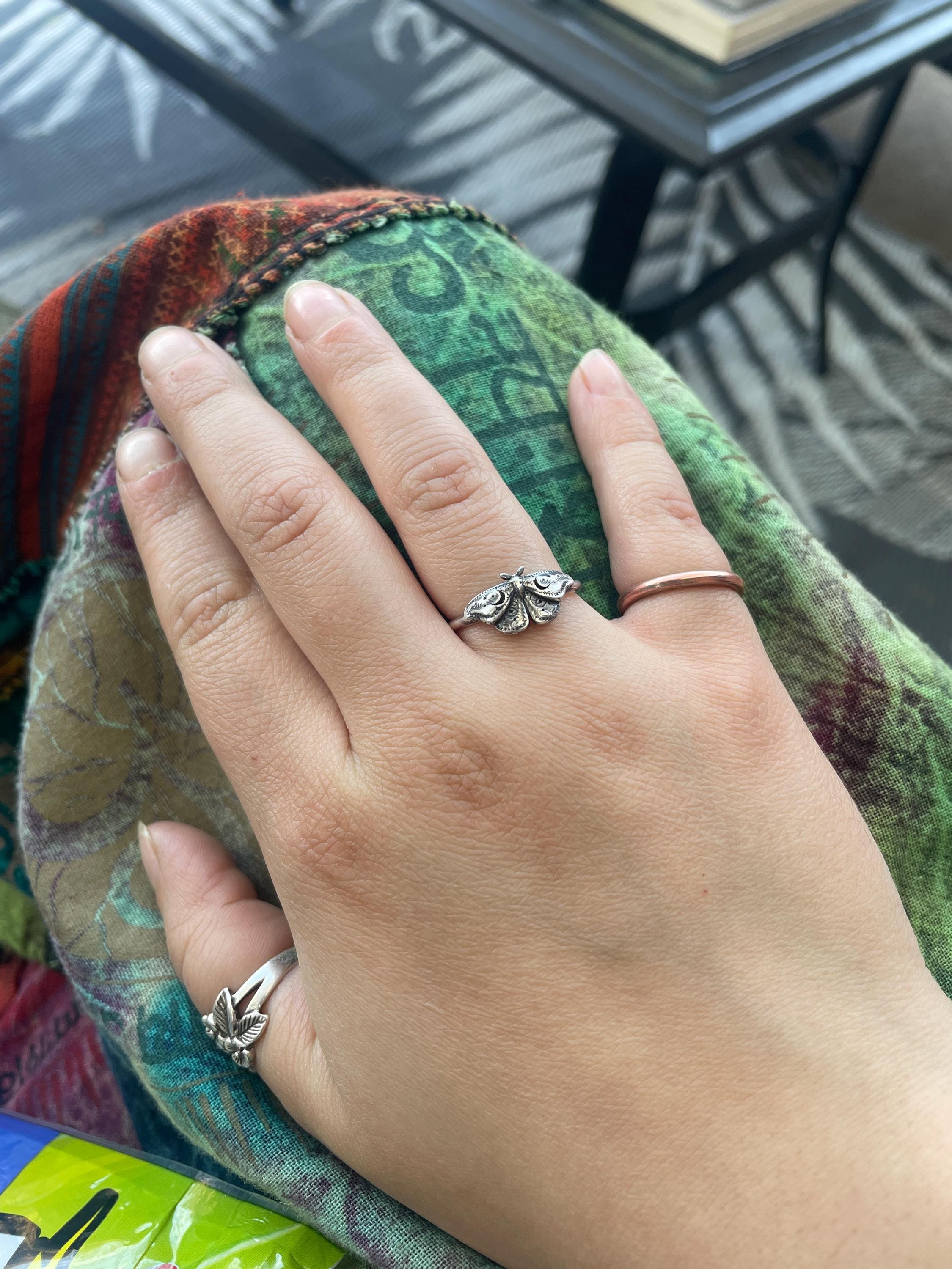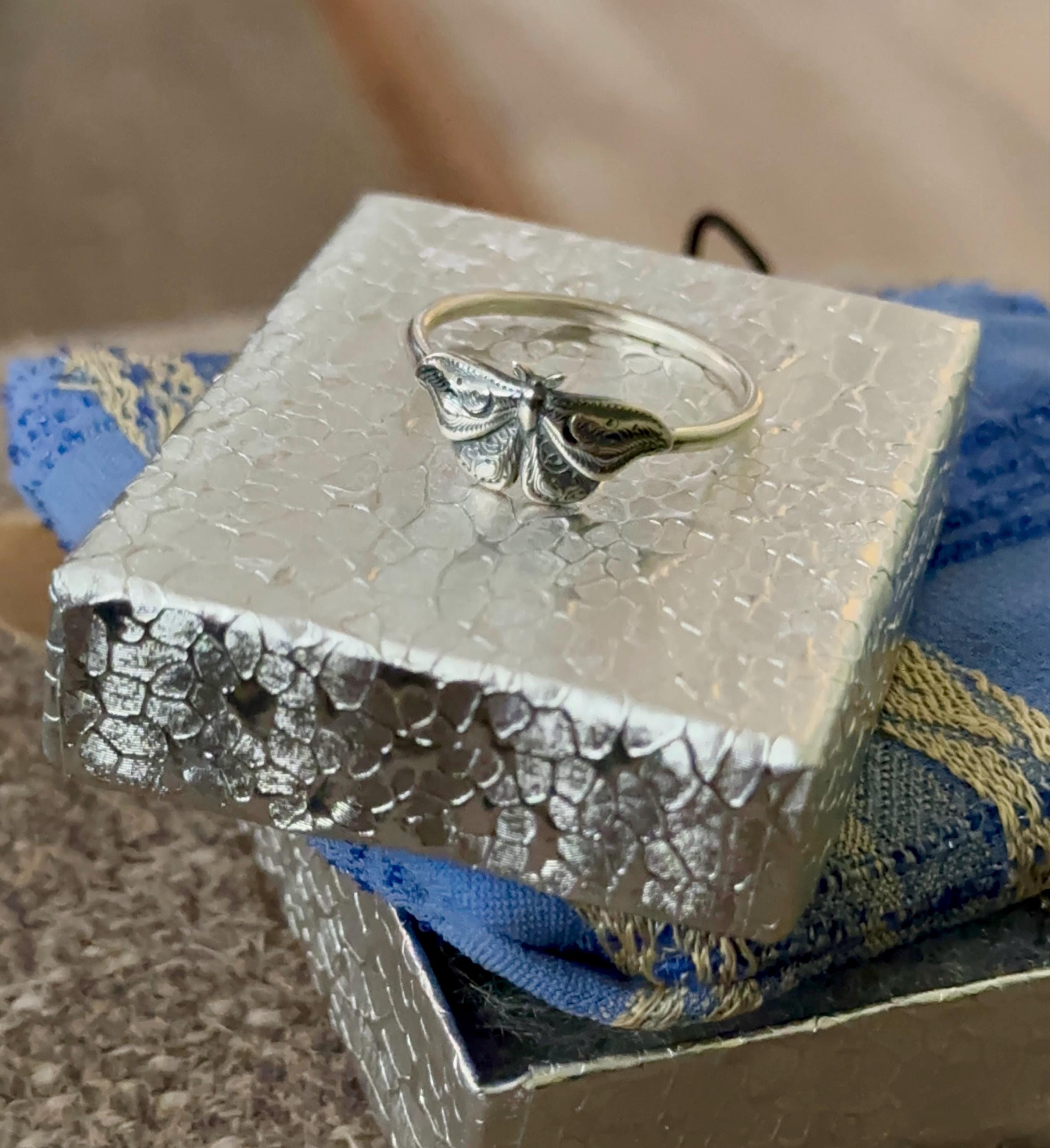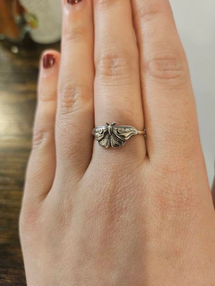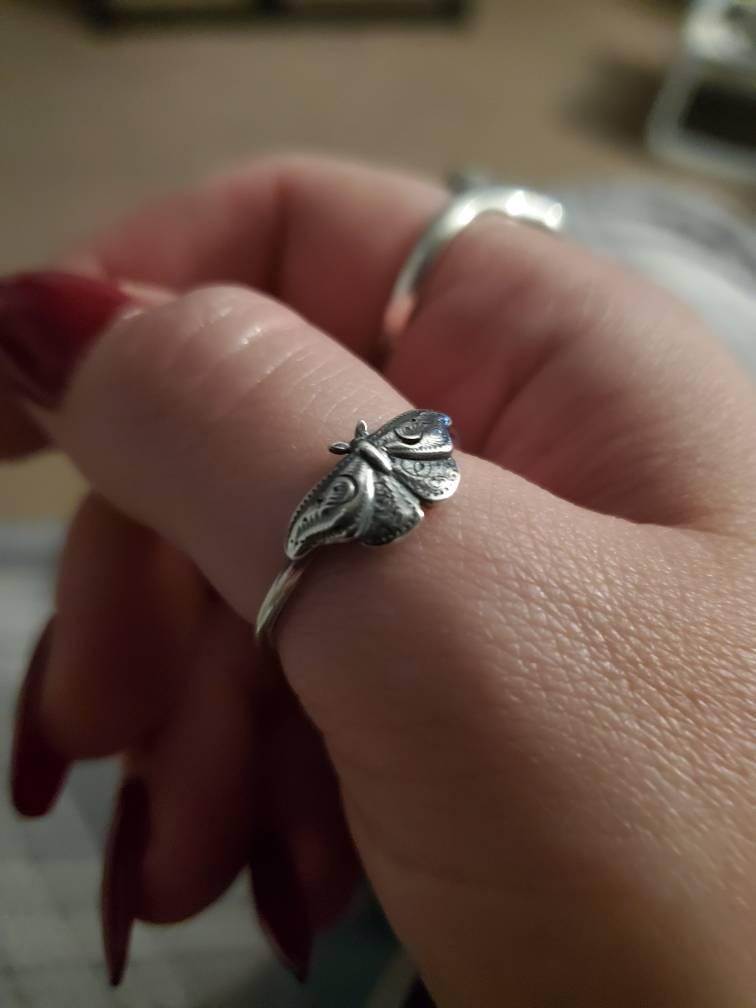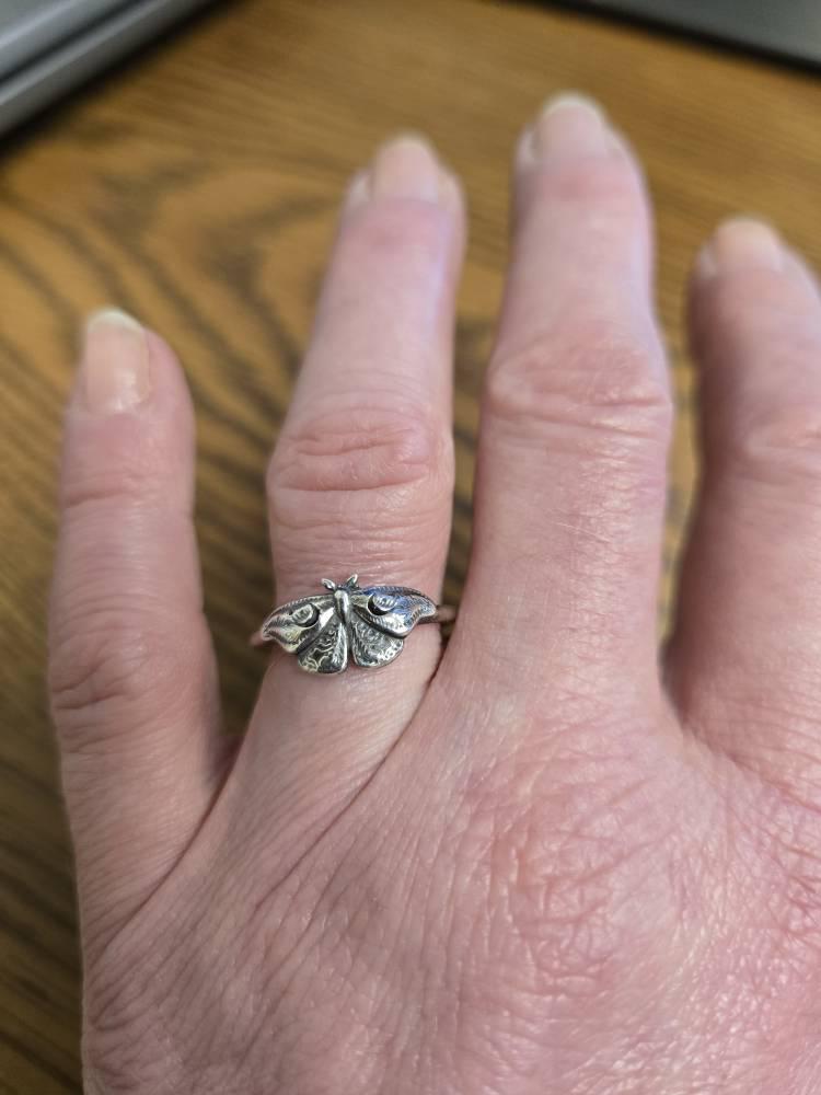This item is a beautiful and delicate sterling silver Hawk Moth ring. The elegant and mysterious moth shape features intricate details including two crescent moons. The ring is fired from 14 gauge sterling silver round wire. Layer with other rings for an edgy look.