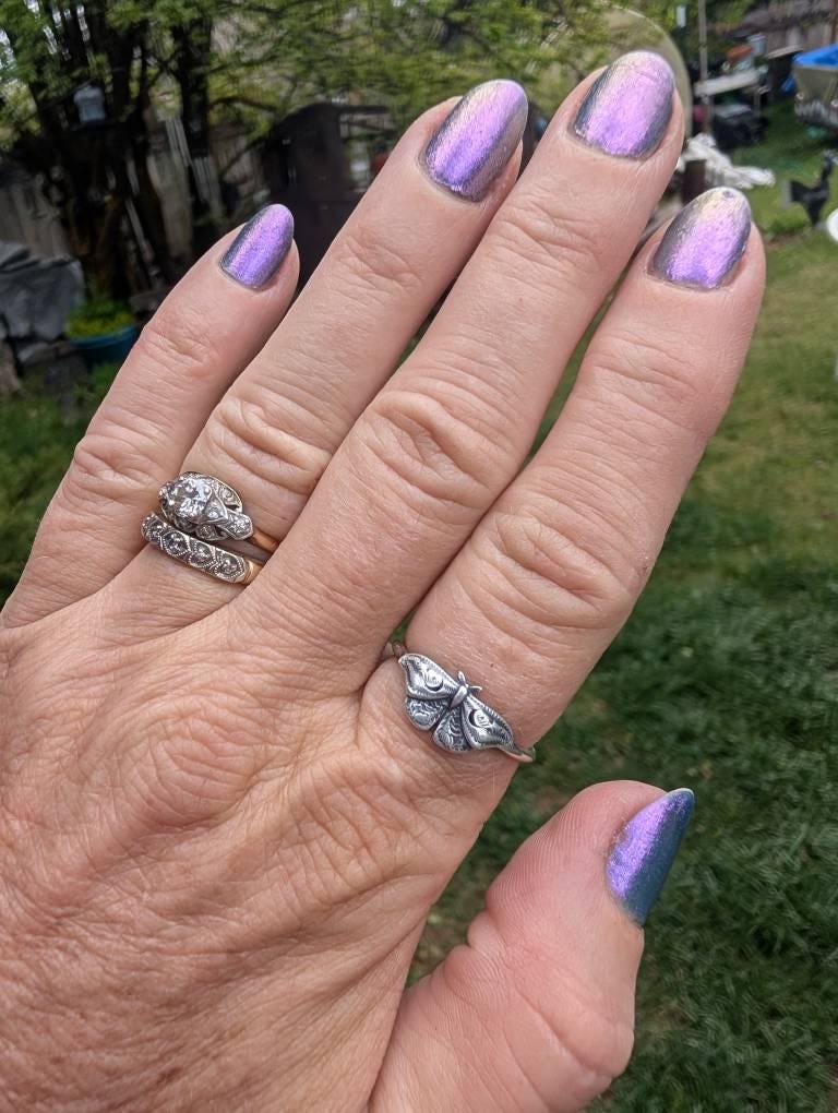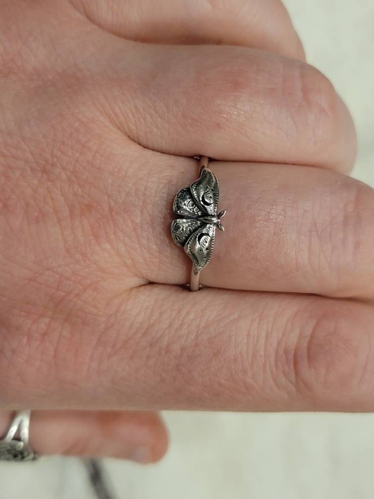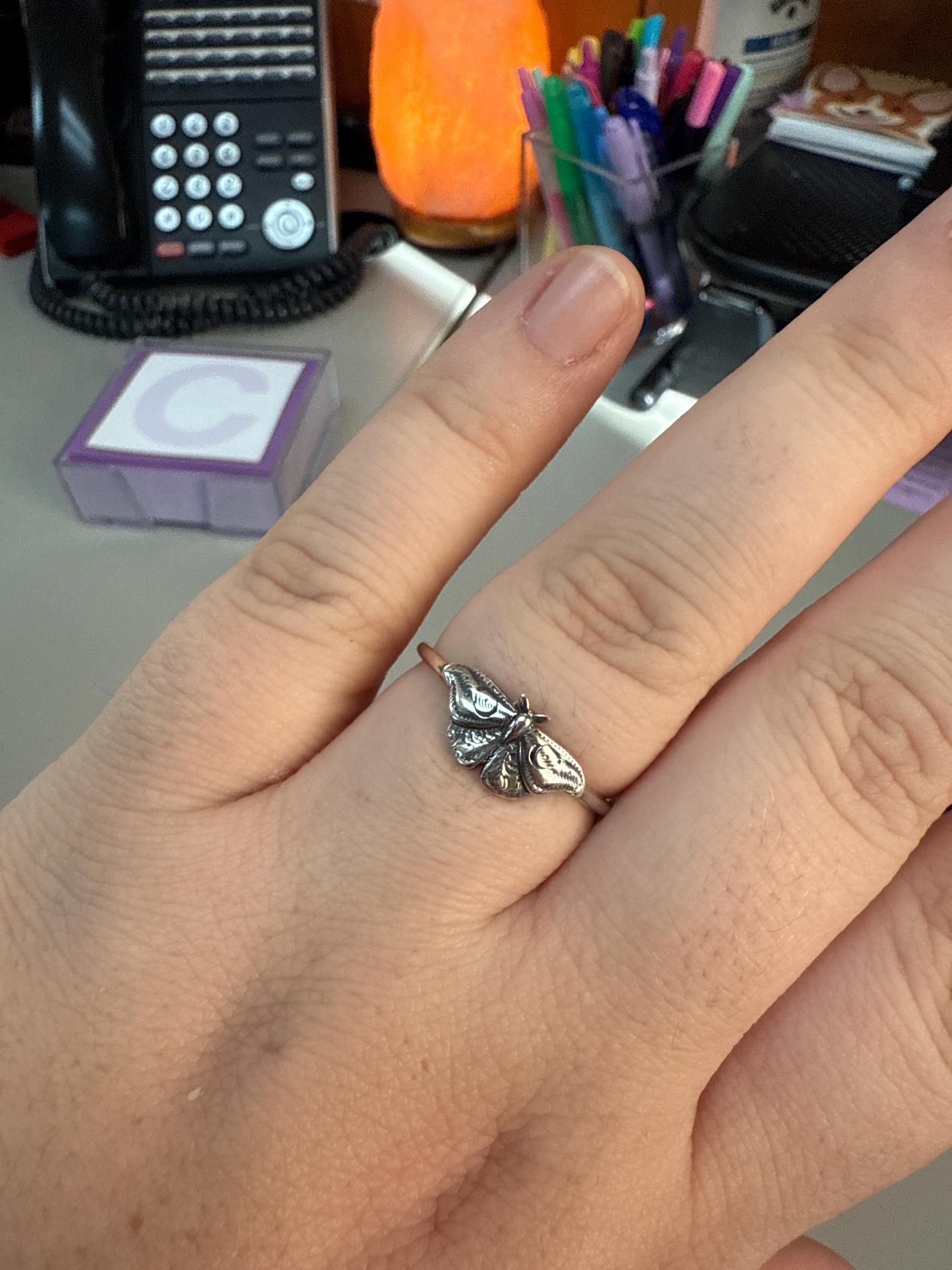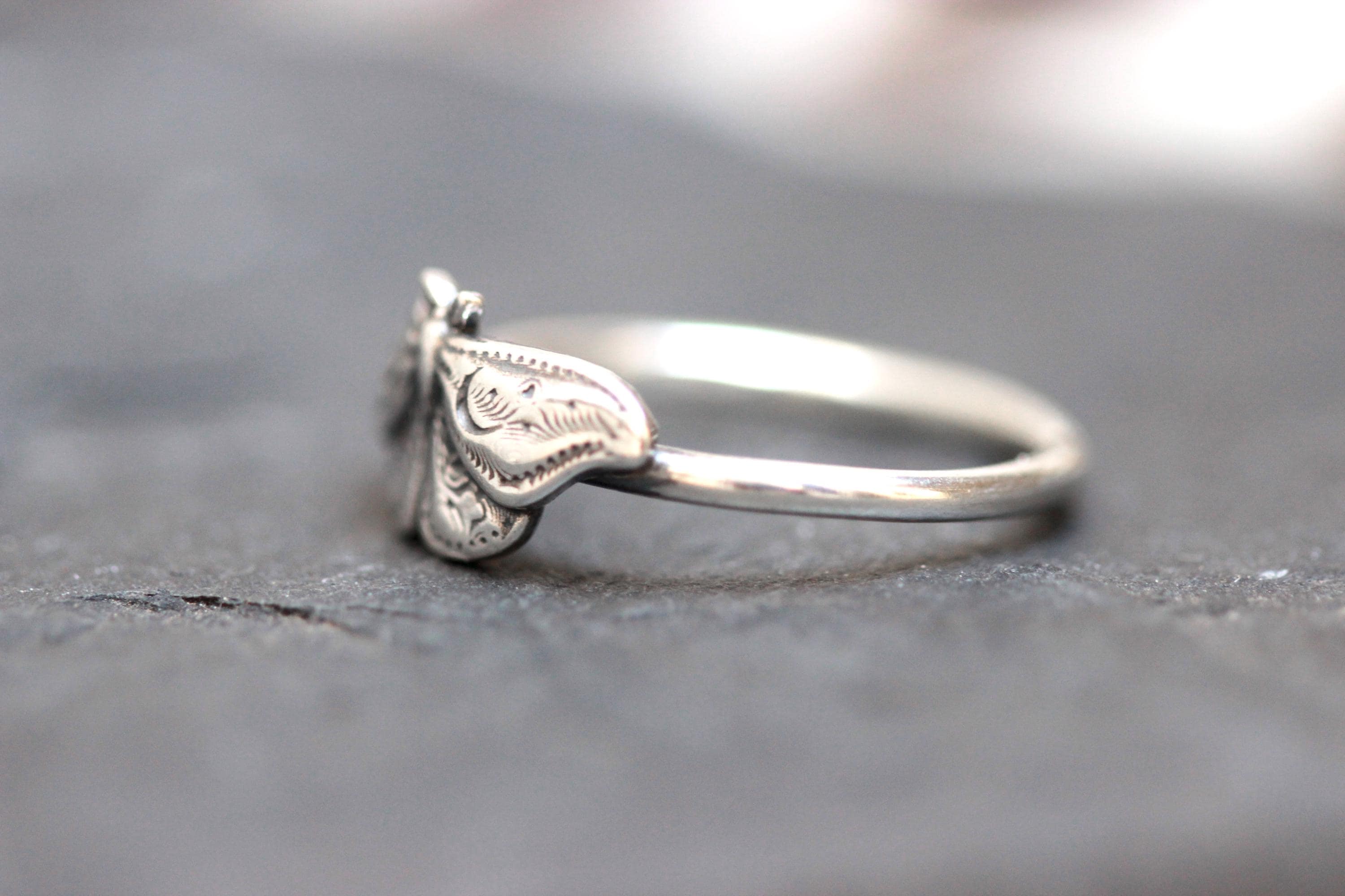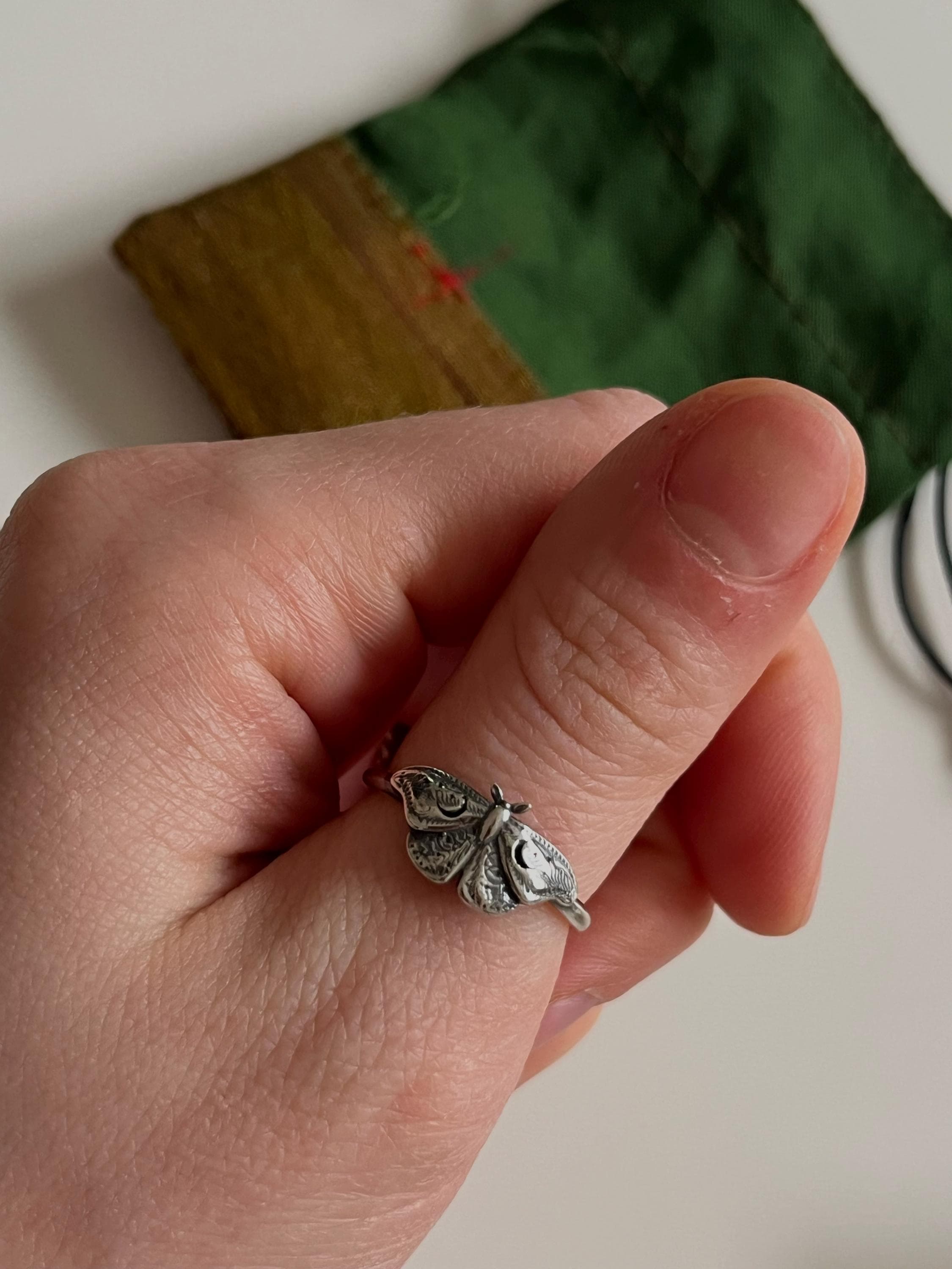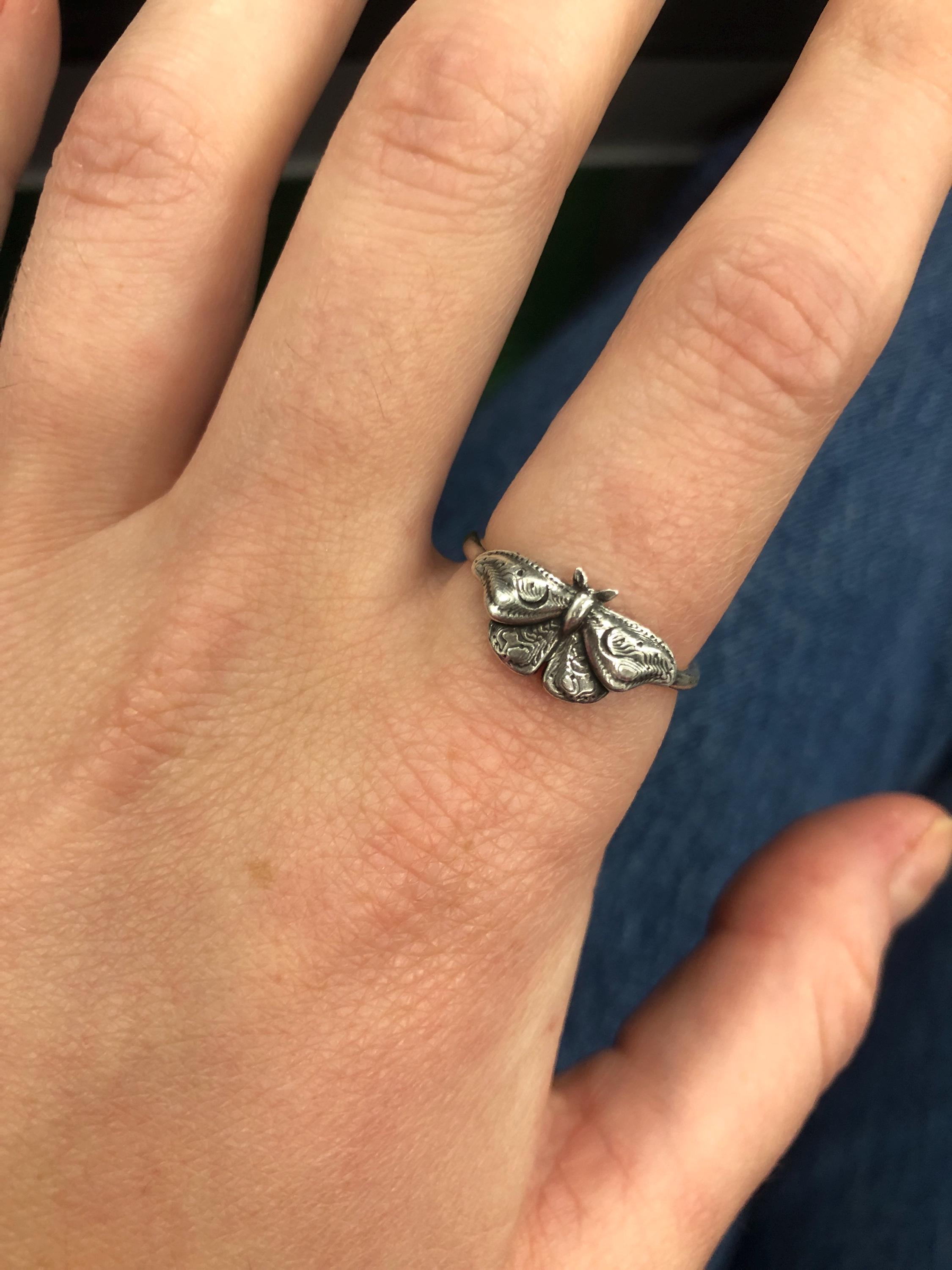 This item is a beautiful and delicate sterling silver Hawk Moth ring. The elegant and mysterious moth shape features intricate details including two crescent moons. The ring is fired from 14 gauge sterling silver round wire. Layer with other rings for an edgy look.