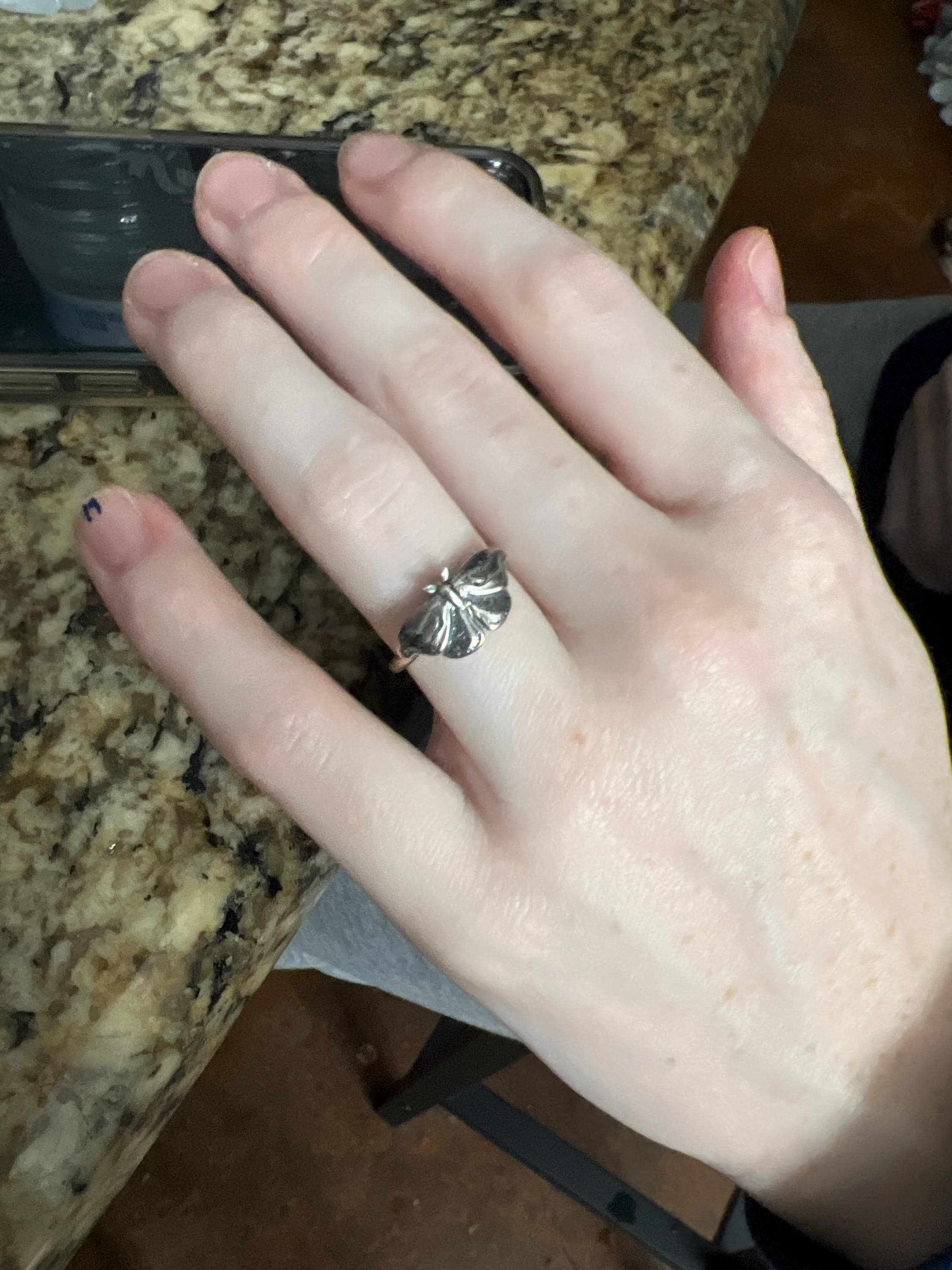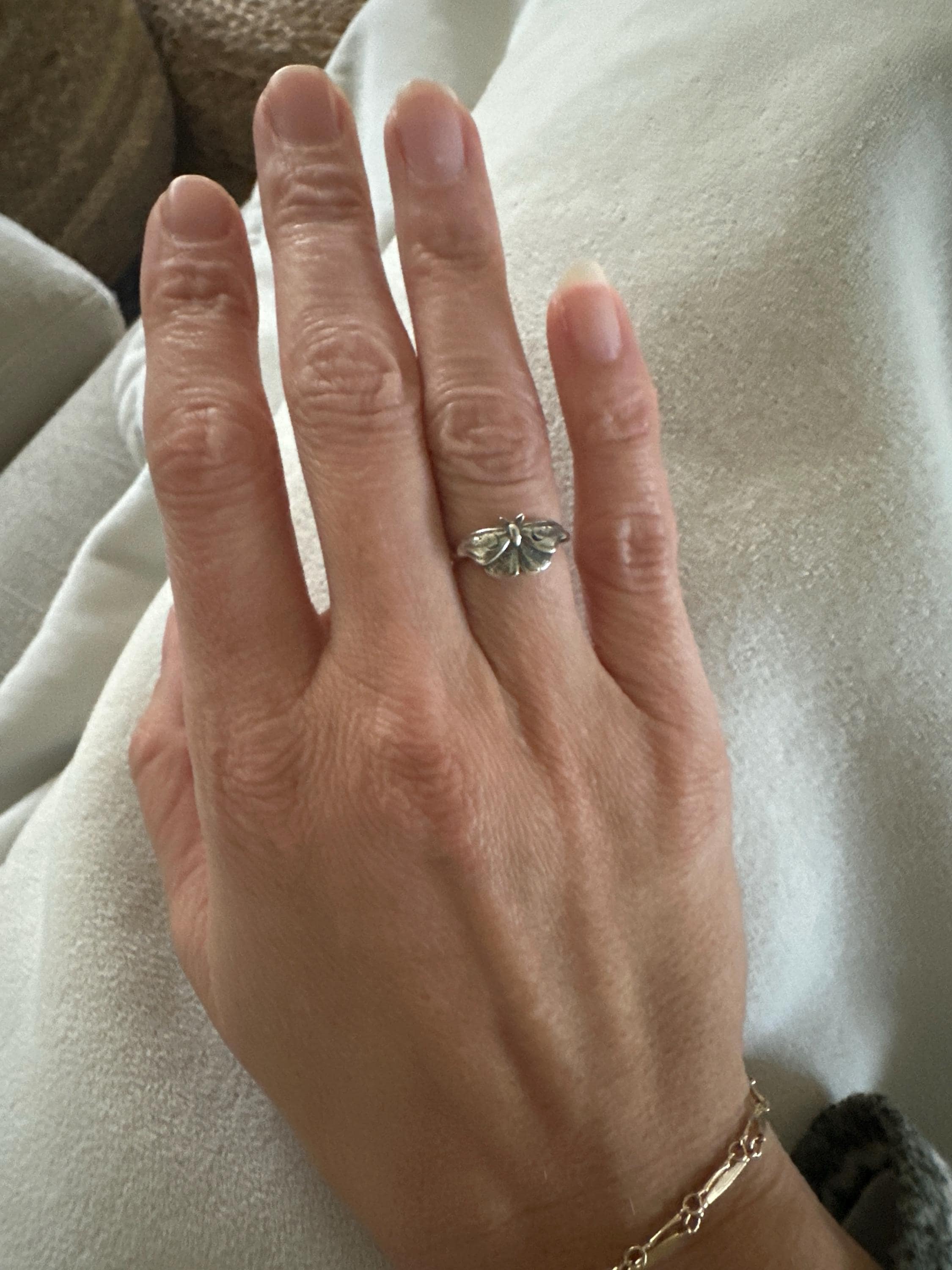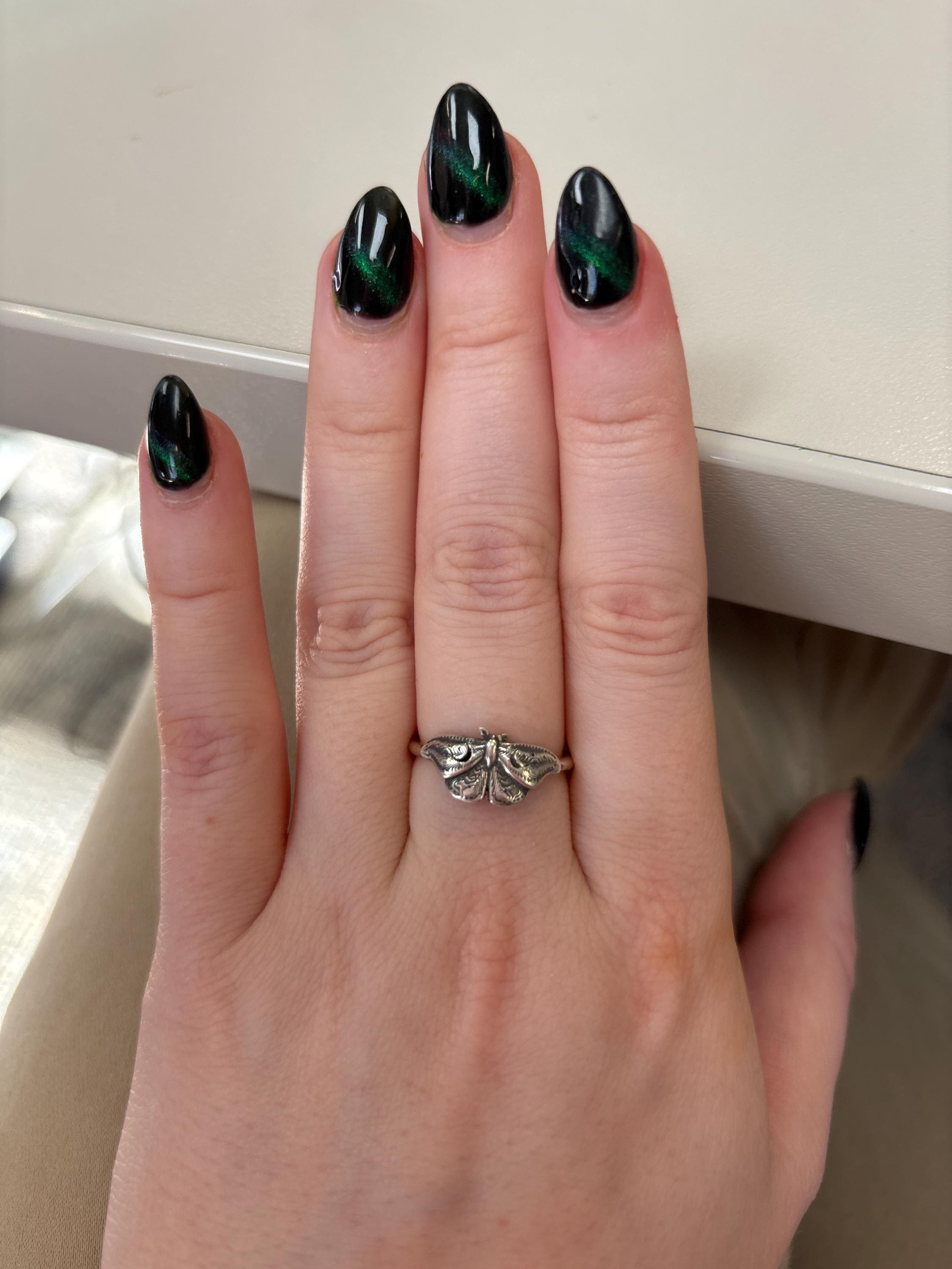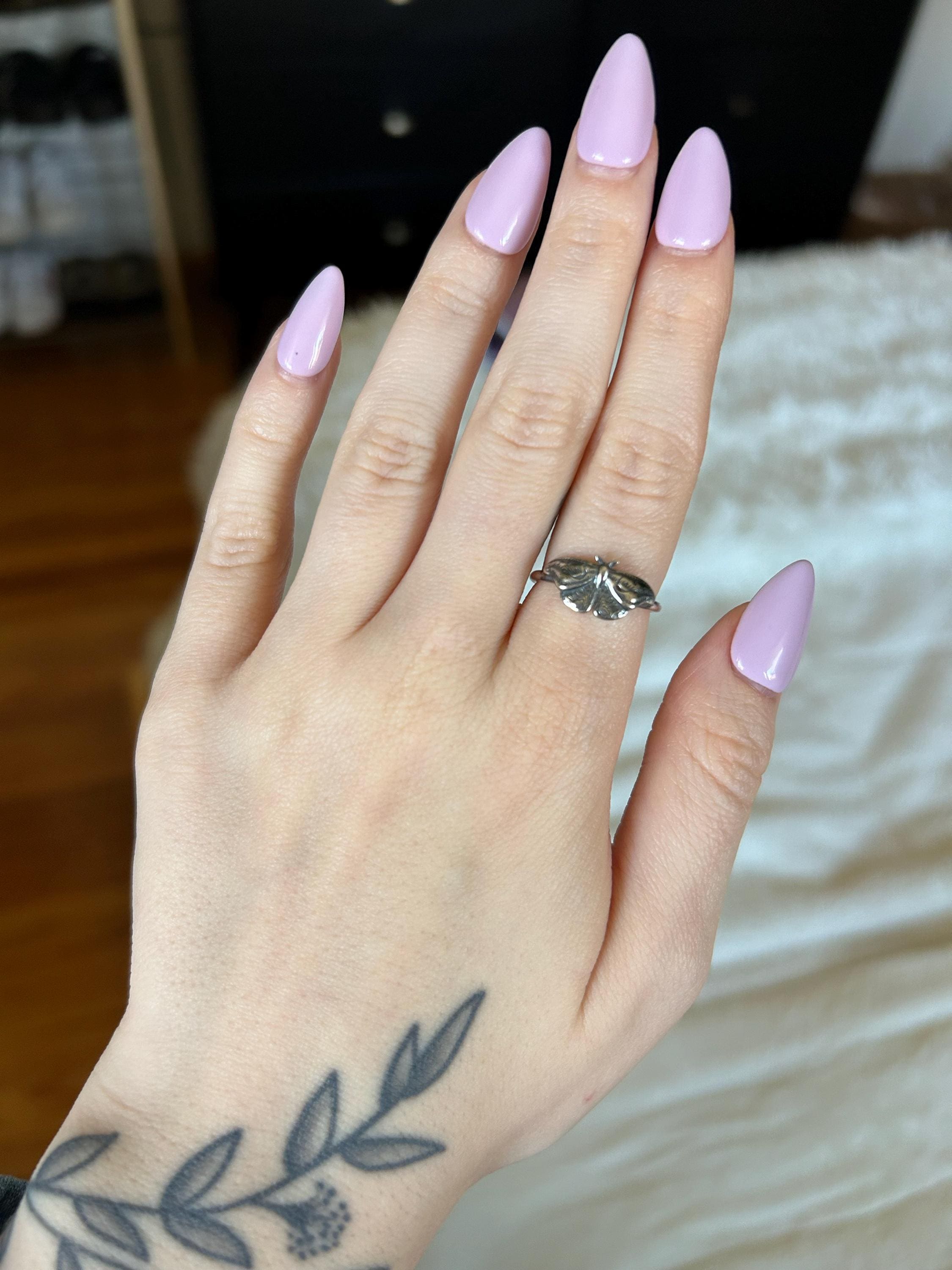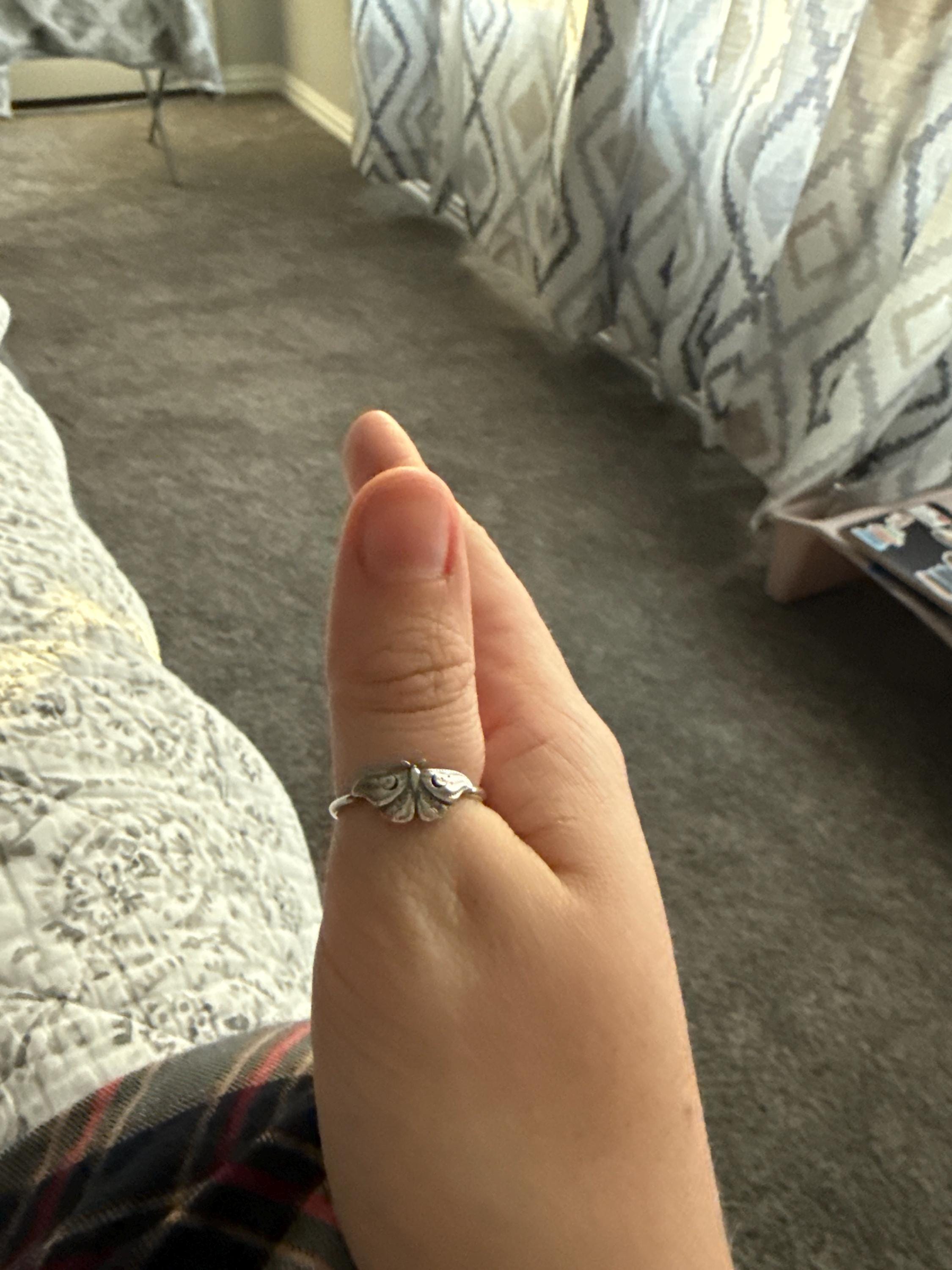 This item is a beautiful and delicate sterling silver Hawk Moth ring. The elegant and mysterious moth shape features intricate details including two crescent moons. The ring is fired from 14 gauge sterling silver round wire. Layer with other rings for an edgy look.